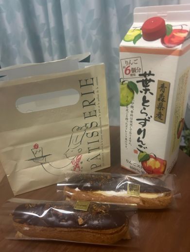 差し入れで大好きなリンゴジュースとエクレア